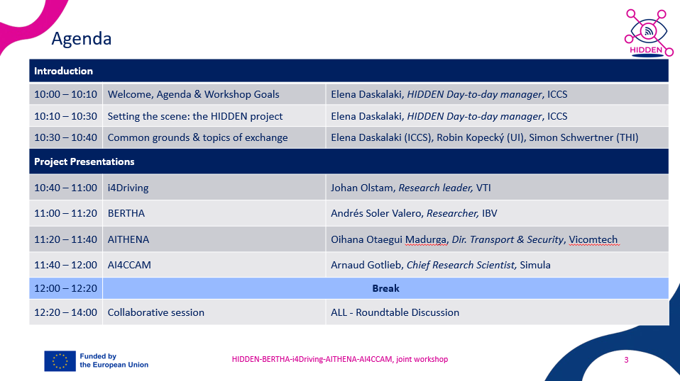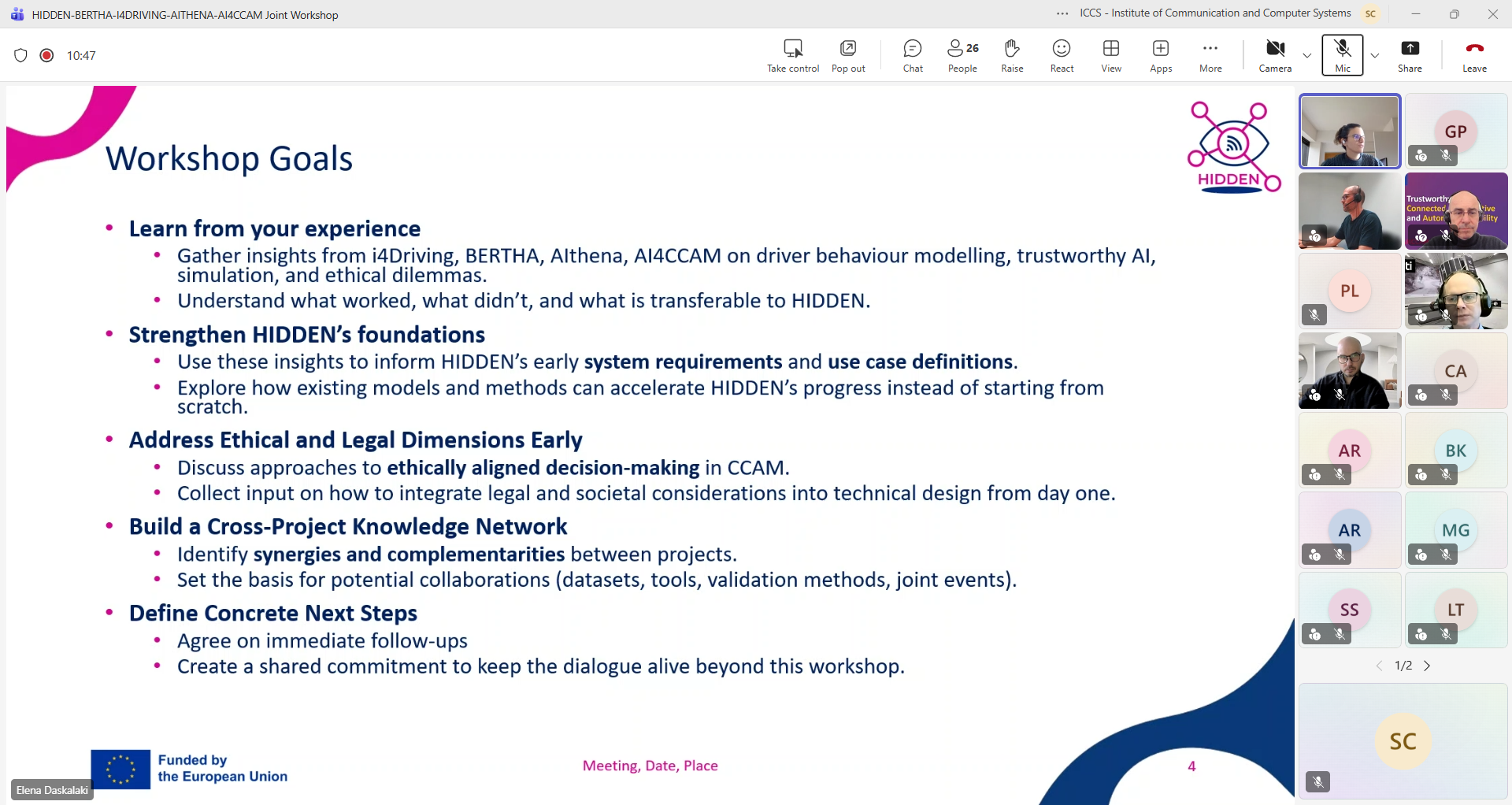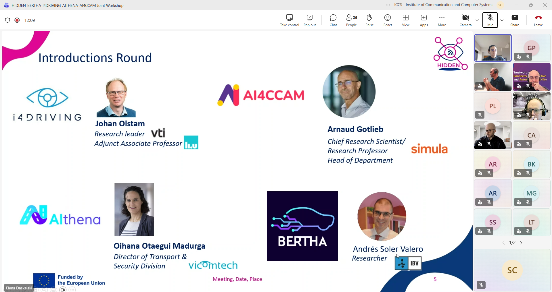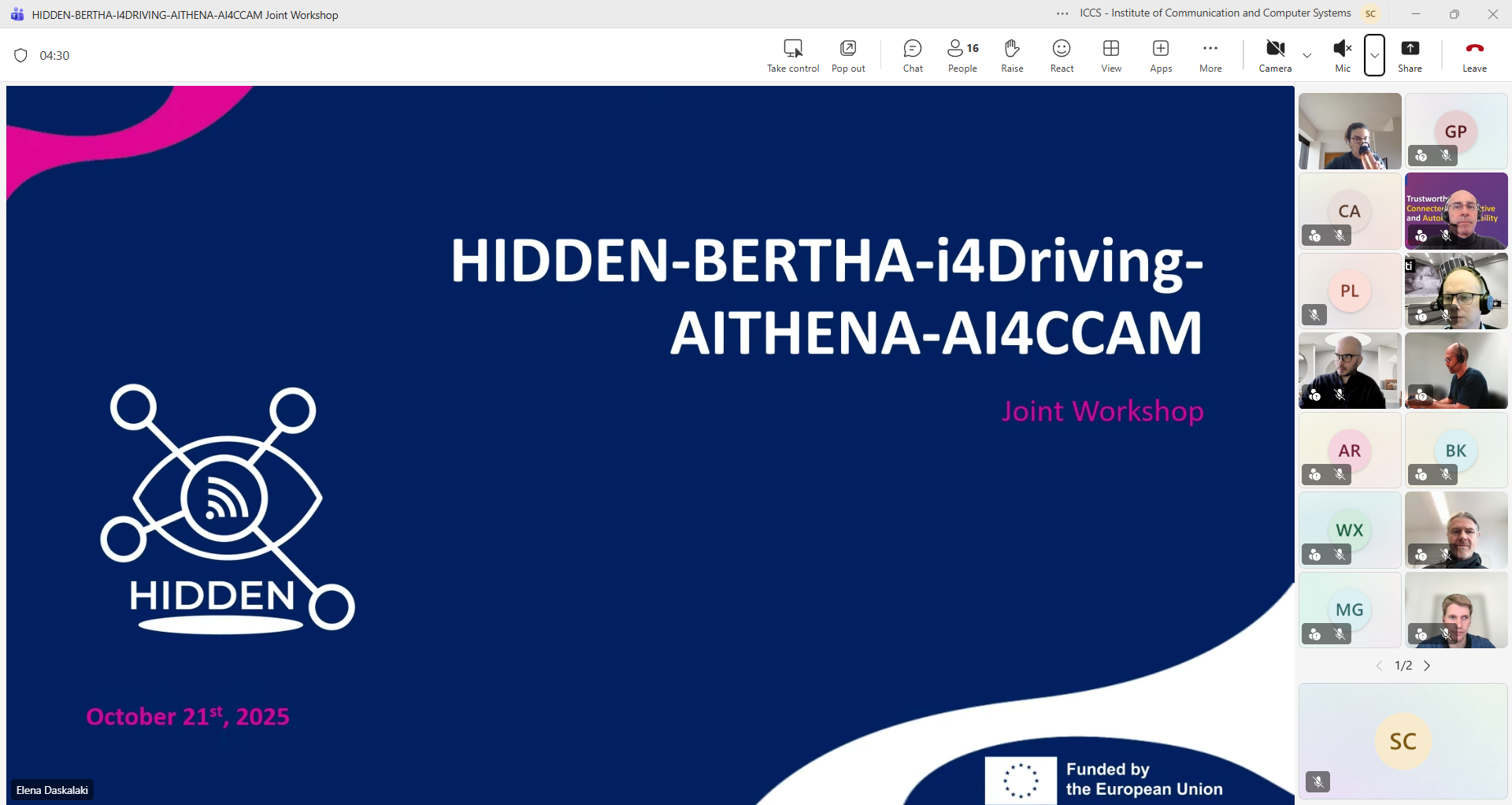 On 21 October 2025, the HIDDEN-BERTHA–i4Driving–AITHENA–AI4CCAM Joint Workshop brought together experts from five Horizon Europe projects to exchange experiences and explore collaboration in the field of Connected, Cooperative and Automated Mobility (CCAM).